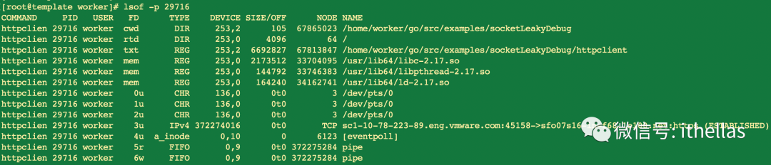 使用"lsof -p <pid>"也可以查询某个进程占用的所有文件描述符。例如下面就是查询进程29716打开的所有文件描述符。lsof显示的信息比/proc/<pid>/fd更全一点,而且条目稍多,因为它将进程所在的目录以及加载的动态库也算在内。但是最终系统报"too many open files"时,是以/proc/<pid>/fd中所包含的条目为准。