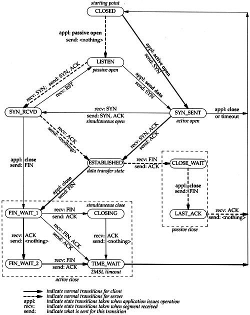 分析socket问题,一定要会看TCP状态机,要清楚各个状态分别代表什么含义,以及相互之间如何转化。下图来自google搜索。