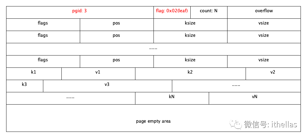 因为一个节点其实就是一个页面,所以每个节点前16个字节就是页面header信息。pgid就是该节点对应的页面ID;flag的值必须是0x02,表示这是一个叶子节点。count的值表示该节点中包含多少个key-value对;如果一个页面无法容纳所有的key-value数据,那么就会分配多个连续的page,这时第一个page header中的overflow就表示后面还有几个page来保存当前节点的数据。