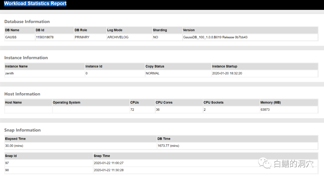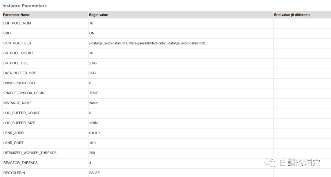 是不是有点小兴奋呢,不过也就这样了,后面没有了,只剩下参数部分。Oracle AWR中比较复杂的高级内容这里都没有,这主要是高斯100目前还没有ORACLE 那么完善的OWI和TIMED MODEL,对于一个新的数据库,有这么多内容可供DBA来分析,已经十分不错了。我想随着高斯DB的发展,这方面的功能会越来越完善的。
