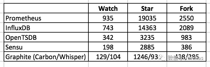 Graphite由Carbon和Whisper组成,所以分别列出了两者的数据。很明显,Prometheus全方位领先于其它项目。一个项目更流行,意味着使用者更多,也意味者生态系统更完善。我们在做技术选型时,这些数据往往可以给我们提供直观的依据。