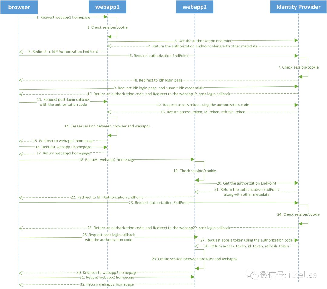 到目前为止,所有的交互过程都是步骤1(用户browser请求访问webapp1)触发后自动发生的。