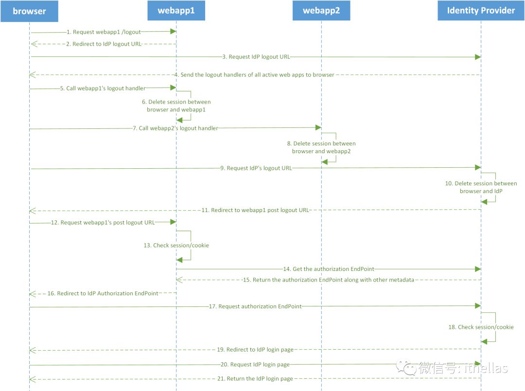 11~21、用户浏览器请求webapp1的Post Logout Redirect URL。webapp1会验证browser与webapp1之间的session,由于session已经失效,所以会重复登录时的过程,最终重定向到IdP的登录界面。有人可能会问,步骤11~21有什么意义?意义就在于用户再次在IdP的登录界面输入并提交username/password之后,还会重新回到webapp1的homepage。当然,你也可以在Post Logout Redirect 页面直接显示一行字“You have already logged out!”。