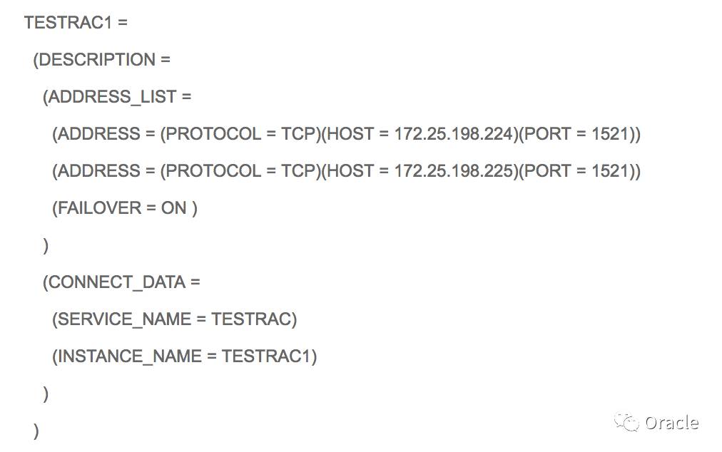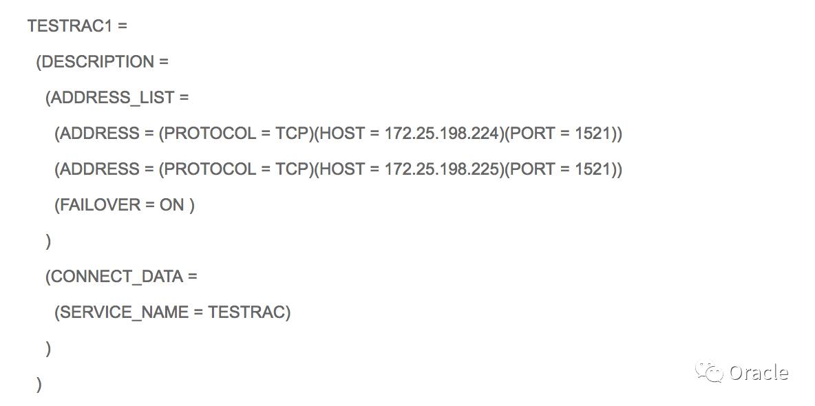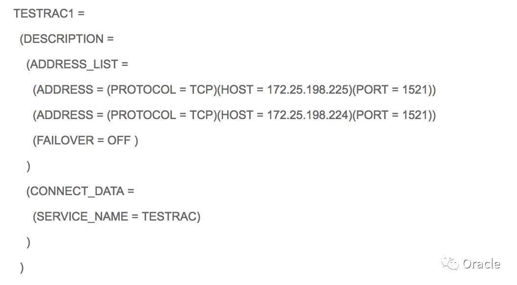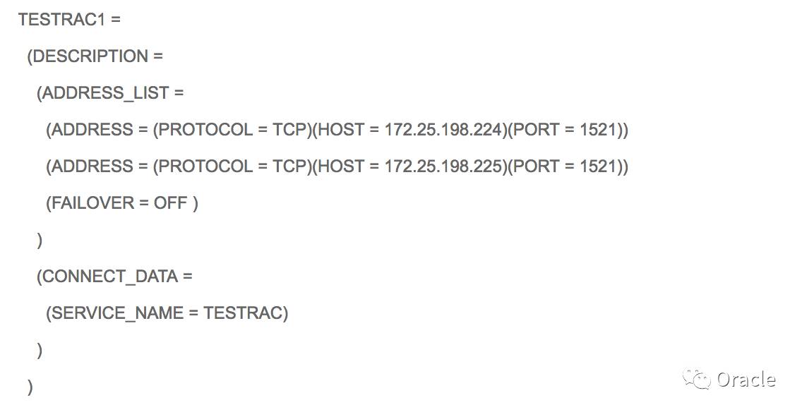 可以看到,如果不指定FAILOVER为ON,则Oracle只会尝试地址列表中的第一个地址,而选择忽略其他的配置,如果设置FAILOVER为ON,则Oracle会尝试所有的地址。