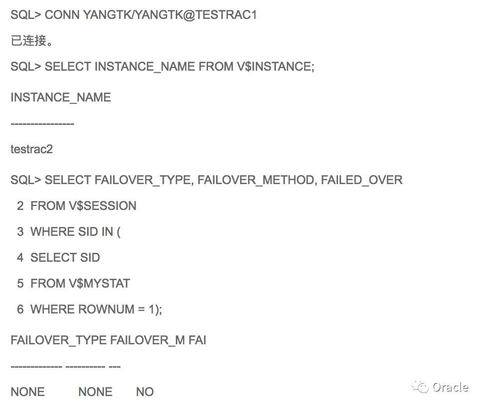 由于配置了静态FAILOVER,当连接实例1失败时,自动可以连接到实例2上,而且从V$SESSION的查询中可以看到,这里动态FAILOVER并没有生效,起作用的是静态FAILOVER特性。