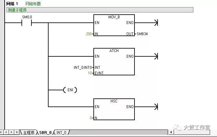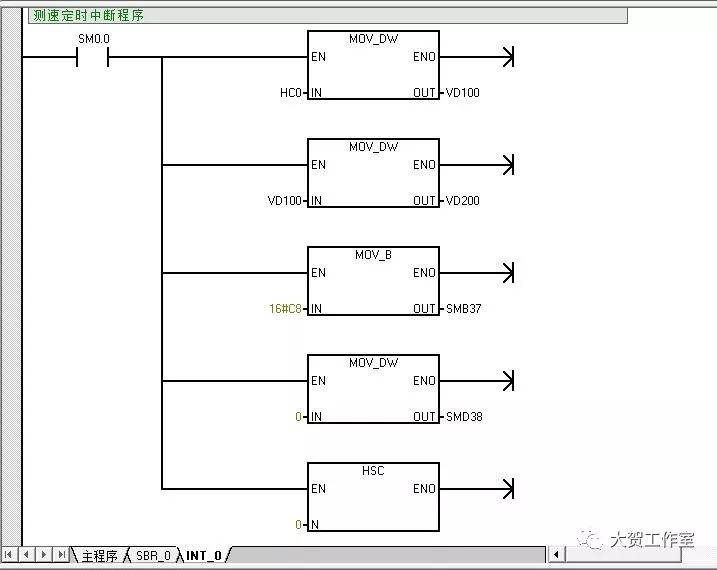 本文采用的是S7-200PLC,用PLC的高速计数器HSC0进行计数,并将计算的数据转换显示在触摸屏端。HSC0对应PLC的I0.0点,用到的高速指令有,定义高速计数器指令HDEF和高速计数器HSC指令。定义高速计数器指令用于指定高速计数器的操作模式,它决定了高速计数器的计数脉冲、计数方向、启动和复位功能。每一个高速计数器使用一条定义高速计数器指令。还用到了定时中断0,中断事件号为10,周期时间写入SMB34,周期时间可以从1ms~255ms。