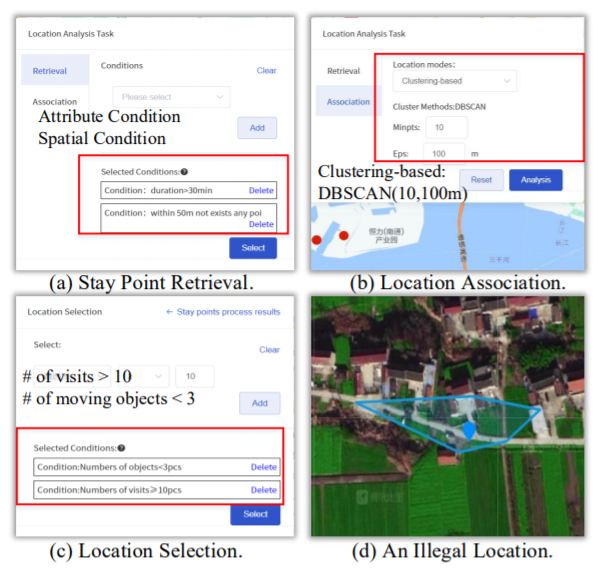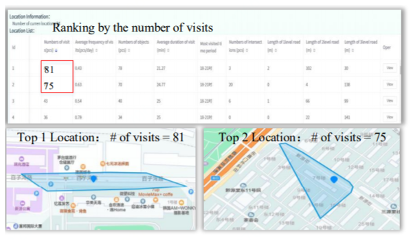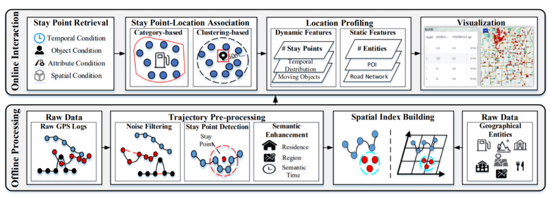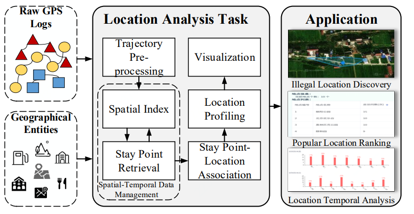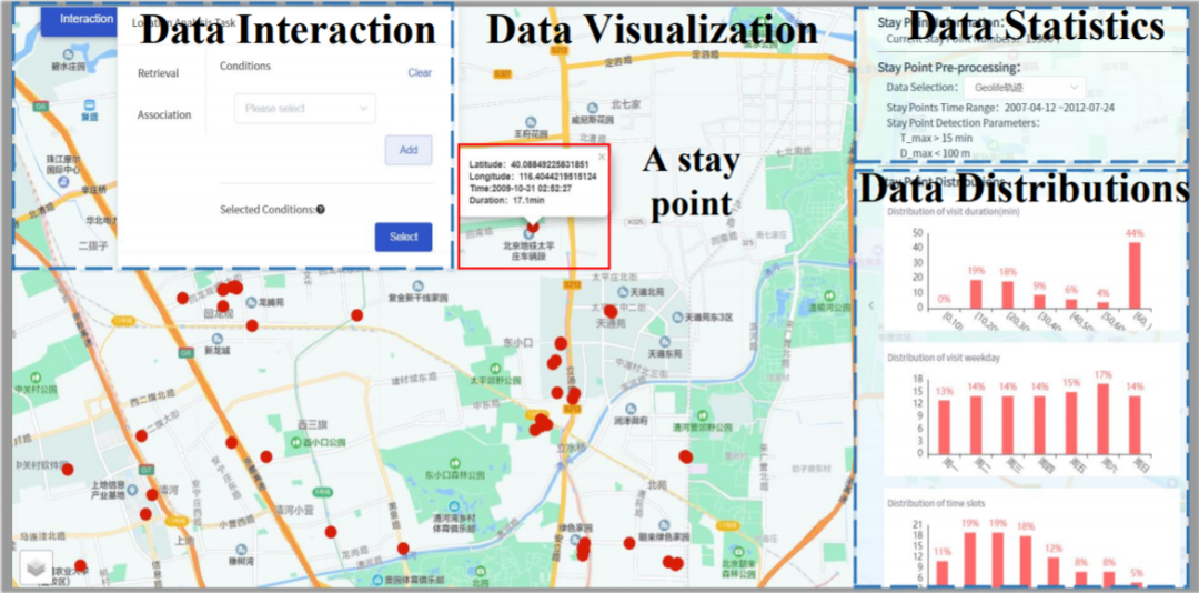 随着定位技术的不断发展,嵌入在手机和PDA设备内的GPS、北斗等位置传感器可以周期性地记录移动对象的位置,产生了海量的轨迹数据,如行人轨迹、出租车轨迹、共享单车轨迹等。来自于这些轨迹数据中的驻留点(即移动对象在一段时间内停留在某个区域范围内产生的轨迹点)蕴含了丰富的移动对象停留信息,如出租车候车、行人游玩、货车装卸货等,这些可以帮助我们获取某一地点的动态访问信息,继而挖掘地点的动态特征,全面理解地点的时空信息。然而现有工作都是针对特定的轨迹数据和应用场景,没有通用的工具去完成驻留点的交互式探索分析。因此本文将总结这些工作的共同点,设计一种基于驻留点的通用地点分析方法,并依托于JUST时空数据引擎[1],开发一个通用的、交互式的平台,完成了不同应用场景的示例展示。一、背景介绍近年来,随着GPS设备的高速普及,产生了海量的轨迹数据,这些轨迹数据蕴含了移动对象不同的行为,如移动行为,停留行为等。其中停留行为提供了一个了解移动对象和地点之间互动的机会。停留行为可通过提取轨迹数据中在时间上连续、在空间上邻近的子轨迹段(即驻留点)获取。数据挖掘工作者在交通、物流等众多领域展开了基于驻留点的地点信息研究,比如在[2]中,作者通过挖掘行人的驻留点及驻留序列,挖掘出城市中有趣的地点信息和行人访问的地点序列信息;在[3]中,作者利用出租车的驻留点数据和出租车本身的状态信息,挖掘出一系列可以高效停车接客的地点,这些地点可以被推荐给空车司机,让其前往接客,也可以推荐给用户,使其更容易乘车;在[4]中,研究人员基于危化品运输车辆轨迹中的驻留地点以及周围路网、POI特征,寻找异常地点,协助工作人员到现场核查发现多起非法生产、存储等现象。由此可见,利用驻留点可以帮助我们感知地点的热度、合法性等动态特性,可以对不同业务场景进行赋能。图1 地点分析任务及应用场景然而,为了支持不同的应用场景,工作人员必须要设计出特定问题的解决方案,且完成定制化开发。这是非常耗时和繁琐的。事实上,这些工作的许多处理步骤是相同的。因此,为了实现平台的通用性,本文总结出地点分析任务所需的两类数据(具体点)和六个步骤,包括轨迹数据预处理、空间索引建立、驻留点检索、驻留点和地点的关联、地点画像生成和可视化,并展示了3个应用案例,由图1所示。二、平台设计本节将详细介绍本平台的具体设计方案。平台的工作分为两个流程,分别为离线处理和在线计算,由图2所示。图2 平台工作流程1、离线处理根据现有地点分析工作,本文使用两类数据作为平台输入,分别为原始GPS点和地理实体数据。其中地理实体数据包含POI和路网数据,它们用于辅助驻留点的检索,地点的空间特征分析。由于精度限制或者信号中断问题,GPS设备可能会产生一些误差,导致原始的GPS点数据存在一些噪音数据。因此,我们将通过轨迹去噪,驻留点检测和语义增强三个步骤把原始的GPS点数据转换为带有语义信息的驻留点。在处理GPS点的过程中,将合理设置每一类轨迹数据的驻留参数,充分考虑每个驻留点的时间、空间和属性特征,设计出使用与不同轨迹数据和业务场景的驻留点属性字段,包括停留时长、停留时间及其语义时间(日、周、年),停留位置及其语义信息(行政区划),停留对象及其常驻地标签,从“4w”(what、when、where、who)四个角度为驻留点的灵活检索打下基础。对于地理实体数据和处理后的驻留点,为了实现交互式的查询分析,将对这两类具有空间属性的数据建立空间索引,缩短检索和连接的时间,提升系统的性能。2、在线计算为实现平台的通用分析能力,该平台设计了3个核心功能,分别是驻留点检索,驻留点-地点关联,地点画像生成。首先,平台支持灵活的驻留点检索功能,会从停留时间、移动对象、属性特征和空间位置这四个方向去检索出符合不同业务场景的驻留点,用于后续的关联、分析。其次,由于不同的应用会关注不同类型的地点,比如一些应用会关注于经常访问的地点,如兴趣/热门地点,一些应用会关注于特定类型的地点,如加油站、景点等,本平台设计了两类驻留点和地点关联的方式,其一为基于聚类的方式,追踪驻留点聚集的任意地点;其二是基于分类的方式,指定特定类型的地点,关注在这些地点内部的驻留点访问情况。最后,根据前两步的检索和关联,为待分析的地点补充画像。地点的画像分为两部分特征,分别为静态特征和动态特征。静态特征围绕地理实体数据,关注地点的地理位置,主要为表现为经纬度,周围的POI和路网分布;动态特征围绕驻留点,关注地点的热度、周期访问情况、时序发展情况,主要表现为驻留点数目、访问时长、访问时间。通过两个角度,可以较为全面地理解这些地点的信息。三、案例演示平台的主页面[5]如图3所示,包括数据交互、数据可视化、数据统计和数据分布面板。图3 平台主页面为了确保通用性,平台接入了三类经过离线处理后的驻留点数据,分别为危化品、出租车和行人的驻留点数据,通过不同功能的组合和参数的调整,完成了如下三个场景的展示。1、非法小化工地点发现此案例使用危化品车辆的驻留点发现非法的小化工地点。首先,由图4(a) 所示,筛选出符号条件的驻留点,条件为停留时长大于30分钟,且周围不存在任何POI;其次,由