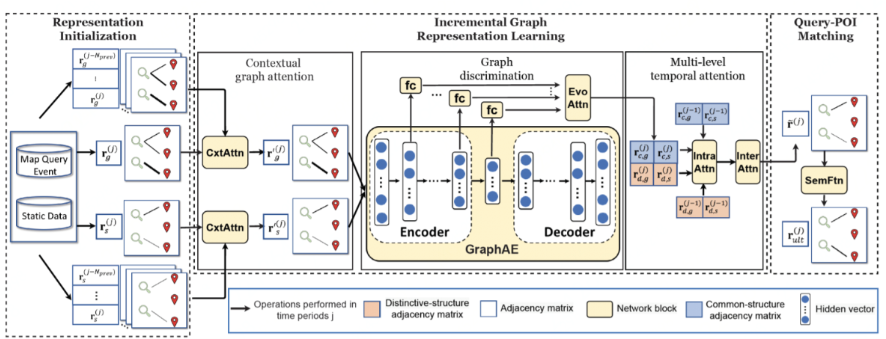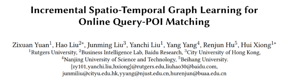 兴趣点(Point-of-Interest, POI)查询是目前地图服务系统与叫车应用中最重要的功能之一。现有的POI查询方法聚焦在比较查询的上下文信息和POI的地理信息之间的静态相似性来返回结果。但是,在实际应用中,由于POI查询具有动态变化的特点,对于不同时空情景下不同用户的相同查询,系统往往不能很好的返回个性化的查询结果。为此,罗格斯大学与百度的研究人员在WWW2021上发表了论文 《Incremental Spatio-Temporal Graph Learning for Online Query-POI Matching》。该论文提出了一种增量的时空图学习框架(IncreSTGL) 用于解决动态场景下的在线POI查询问题。