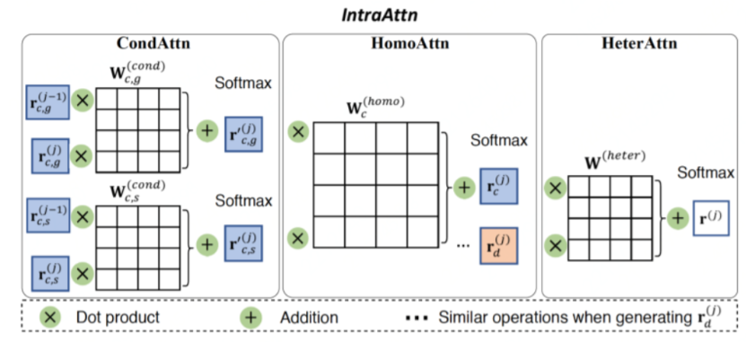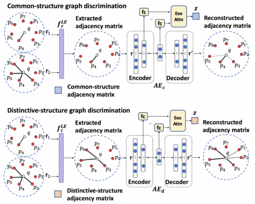 微观图, GraphAE通过捕捉动态时变漂移的用户偏好,融合社会效应和个性化偏好。具体来说,图辨别器 渐进地提取两个连续时间段之间一般偏好转移和用户个性化偏好转移的相似性和差异性,并分别将它们嵌入公共结构和不同结构的图邻接矩阵中。如图5所示,对于邻近的两个交互图,GraphAE 能 够基于他们的共有与不同结构通过encoder-decoder框架重构成新的邻接矩阵。值得一提的是, encoder部分中的隐变量通过多层级方式以注意力的方式得到。损失函数为重构误差。对于宏观图 与微观图,分别重构得到公共图与个性图,一共包含四个组合。