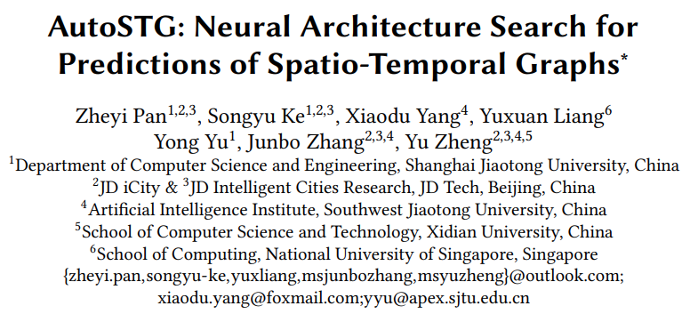 [5] Li T, Zhang J, Bao K, et al. AutoST:Efficient Neural Architecture Search for Spatio-Temporal Prediction. In:Proceedings of the ACM SIGKDD Conference on Knowledge Discovery and Data Mining(KDD). 2020.