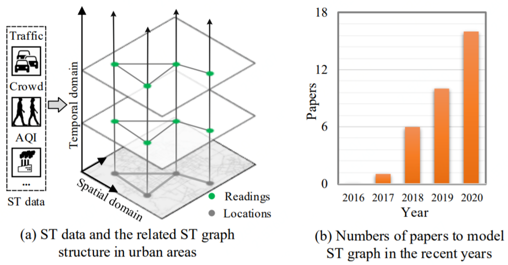 随着城市感知技术的不断发展,城市中积累了大量时空数据,如交通流量、GPS轨迹、传感器记录值等,而这些数据中蕴含着城市发展变化的大量知识,如交通流量、GPS轨迹等数据描述了城市人群的出行情况,空气质量等传感器数据反映了城市中空气污染物分布情况等,因此对城市时空数据进行分析与精准预测是城市智能化建设的重要研究问题。如图1(a)所示,考虑数据的时空属性,交通、人流、空气质量等城市数据可以建模为时空图结构。图1(b)展示了近年来人工智能和数据挖掘领域的顶级会议上发表的与时空图预测相关的论文数量(KDD、AAAI、IJCAI等AI领域顶级国际会议)。可以看到,由于它背后的巨大应用价值,时空图预测正在成为一个新的研究热点。