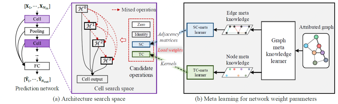 如图2所示,我们提出的AutoSTG框架主要包含两个模块:(a)网络结构搜索;(b)参数权重学习。在网络结构搜索中,我们需要设计搜索空间,让搜索到的模型能够建模数据中的时空相关性。在参数权重学习的模块里,我们采用元学习的方式,先用图元知识学习网络从属性图中学习节点和边的元知识,然后用元学习网络学习时空网络中的参数权重,从而建模属性图对时空相关性的影响。