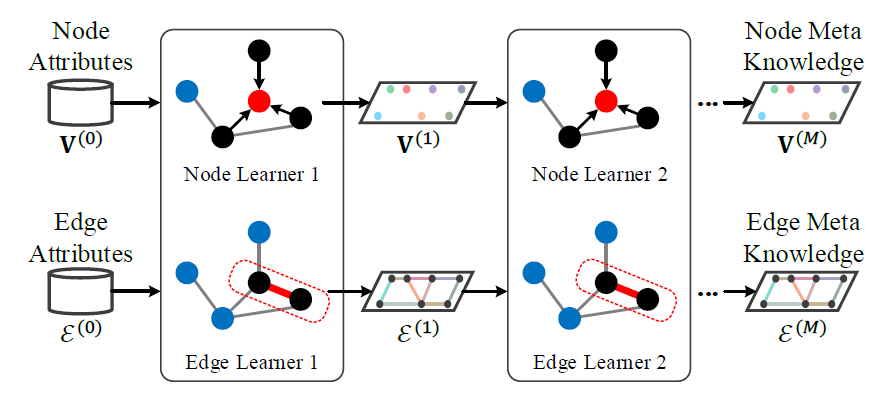首先,我们需要从属性图中学习节点与边的元知识。为了建模节点与边的相互作用,我们提出了一个图的元知识学习网络。如图3所示,该网络需要迭代多步,每步分为两个部分:(a)对于每个节点,用图卷积网络,根据边的表征聚合其周围节点的表征;(b)对于每条边,聚合其相连的两个节点的表征。通过多次迭代,我们可以在属性图上传播节点和边的属性信息,学到有效表征,并将其作为节点和边的元知识。