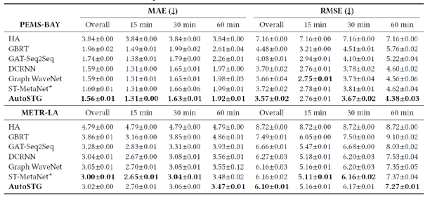 如表所示,与所有基准模型相比,AutoSTG框架可以自动学习时空神经网络结构,并取得与人工精心设计的模型相近的预测准确度。尤其是在PEMS-BAY数据集中,AutoSTG搜索出的结构在预测准确度指标MAE和RMSE上都提升2%。这也进一步说明,AutoSTG是一个非常有效的时空神经网络结构搜索框架。