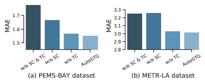 我们也在两个数据集上测试AutoSTG框架及其变体来验证空间图卷积和时间卷积在AutoSTG中的有效性。如图4所示,在搜索空间中删去空间图卷积或时间卷积,在两个数据集上的预测精度都有所下降。其中,空间图卷积操作对模型精度的影响比时间卷积操作更大。这主要是因为,交通数据的空间相关性较为复杂,要在这两个数据集上进行准确预测都需要大量表示空间相关性的特征;而网络输入中涉及到的时间片段较少,因此,直接用全连接神经网络一定程度上也可以建模时间上的相关性。但总的来说,这两种卷积操作在AutoSTG中都起到了重要的作用。