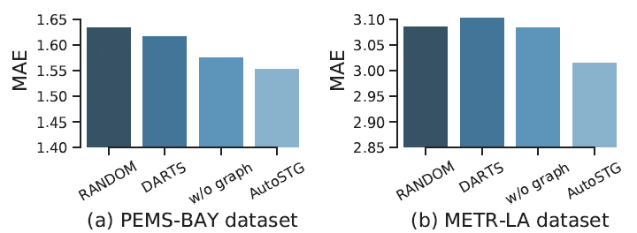 此外,为了验证AutoSTG中各算法模块的有效性,我们还测试四组AutoSTG框架及其变体。如图5所示,由于较为完善地定义了搜索空间,从中随机采样一个网络结构也可以取得不错的预测结果。其次,参数元学习方法可以有效地提升模型的精度,这说明参数元学习是十分有效的。最后,在进一步考虑节点和边之间特性关联的情况下,预测准确度还能够进一步提升。综上所述,AutoSTG框架里的每一个算法模块都能显著提升搜索出来的网络结构的性能。