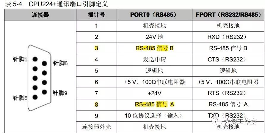 本实验用的是CPU224+,和变频器通讯线的制作如下: