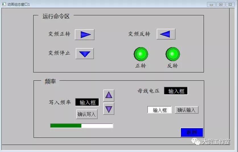 本小实验要完成的功能:在触摸屏端远程通讯设定变频器的频率;在触摸屏端控制变频器的正转、反转和停止,并将正转反转停止等信号用指示灯显示出来。