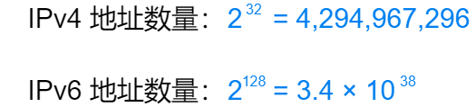 2019 年 11 月 25 日已分配完公网 IPv4 地址,以后就没有多余地址可以分配了。短期内可以使用 NAT 技术进行缓解。长期来看,还是要用 128 位的 IPv6 地址替代 32 位的 IPv4 地址,IPv6 有 3.4×10^38 个可用地址,多得不得了,可以满足未来 IP 地址的需求。