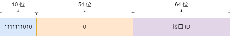 链路本地地址的前 10 位固定是 1111111010 ,之后的 54 位固定为 0 ,最后 64 位是接口 ID 。也就是说,链路本地地址的前缀为 FE80::/10 。