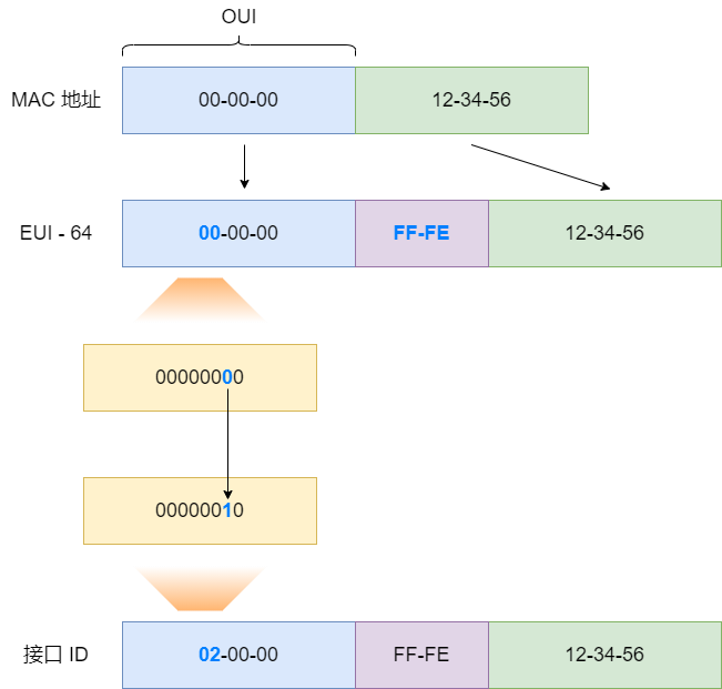 把 MAC 地址转换成接口 ID ,使用 MAC-to-EUI64 转换法。简单的讲,就是使用接口的 48 位 MAC 地址,在 MAC 地址中间,也就是 OUI 后面,插入一个固定的十六进制数 0xFFFE ,并把第 7 位的 U/L (全局/本地)位设置为 1 ,这样就转换为一个 64 位的接口 ID 。