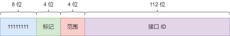 组播地址的前 8 位全是 1 ,后面跟着 4 位标记位,再后面就是 4 位表示地址范围。最后的 112 位作为组 ID ( Group ID ),标识不同的组播组。前面的 80 位是 0 ,只使用后面的 32 位。