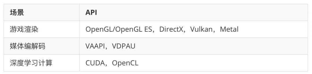 渲染(OpenGL、DirectX,etc.) 计算(CUDA,OpenCL) 媒体编解码(VAAPI...)