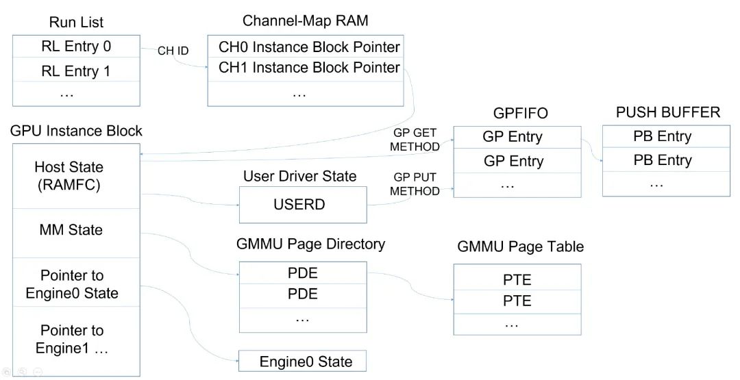 每个 Channel 对应一个 Instance Block,它包含各个 Engine 的状态,用于 Context Switch 时的 Save/Restore;包含 GMMU pagetable;包含 RAMFC —— 其中包括 UMD 控制的 USERD。