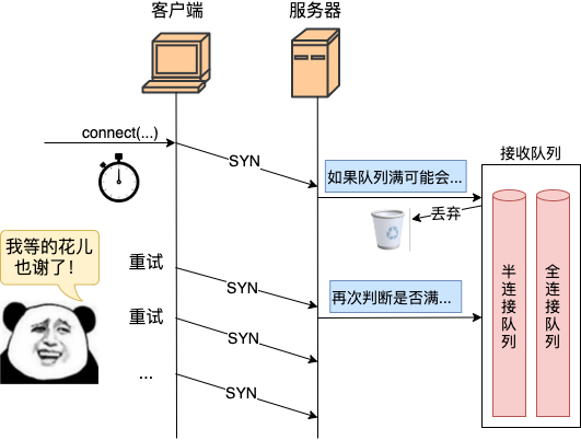 服务器等到半连接定时器到时后,向客户端重新发起 synack ,客户端收到后再重新回复第三次握手 ack。如果这期间服务器端全连接队列一直都是满的,那么服务器重试 5 次(受内核参数 net.ipv4.tcp_synack_retries 控制)后就放弃了。