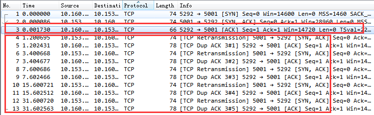 第一个红框内是第三次握手,其实这个握手请求在服务器端以及被丢弃了。但是这时候客户端并不知情,它一直傻傻地以为三次握手已经妥了呢。不过还好,这时在服务器的半连接队列中仍然记录着第一次握手时存的握手请求。