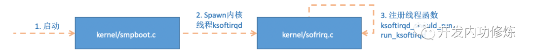 系统初始化的时候在kernel/smpboot.c中调用了smpboot_register_percpu_thread, 该函数进一步会执行到spawn_ksoftirqd(位于kernel/softirq.c)来创建出softirqd进程。