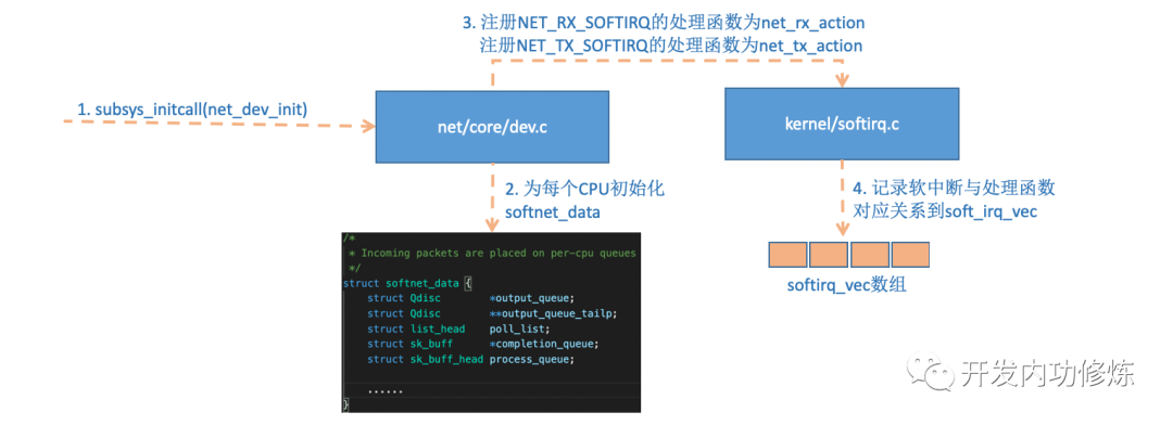 \1. 创建ksoftirqd线程,为它设置好它自己的线程函数,后面指望着它来处理软中断呢 \2. 协议栈注册,linux要实现许多协议,比如arp,icmp,ip,udp,tcp,每一个协议都会将自己的处理函数注册一下,方便包来了迅速找到对应的处理函数 \3. 网卡驱动初始化,每个驱动都有一个初始化函数,内核会让驱动也初始化一下。在这个初始化过程中,把自己的DMA准备好,把NAPI的poll函数地址告诉内核 \4. 启动网卡,分配RX,TX队列,注册中断对应的处理函数