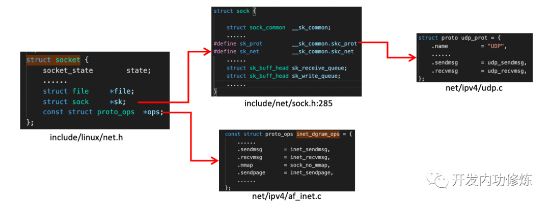 对应的是协议的方法集合。每个协议都会实现不同的方法集,对于IPv4 Internet协议族来说,每种协议都有对应的处理方法,如下。对于udp来说,是通过inet_dgram_ops