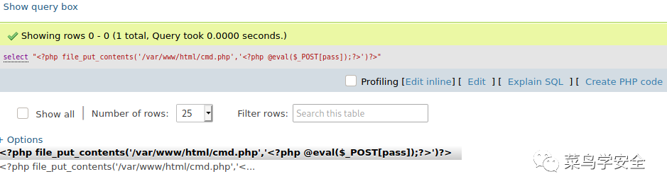 这里getshell就可以通过包含session临时文件来实现命令执行 执行一个SELECT '<?php phpinfo(); ?>'
