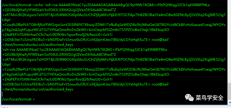 进入到ubuntu用户,里面会存在.ssh目录,我们需要将密钥写入.ssh目录并将文件命名为authorized_keys(目标机.ssh目录权限必须为700)。依次执行以下两条命令写入密钥文件。