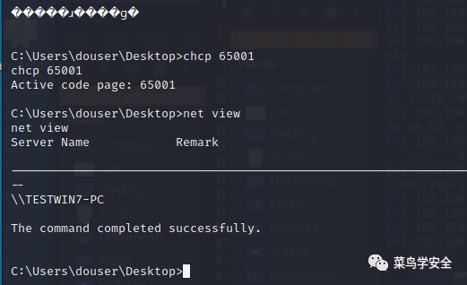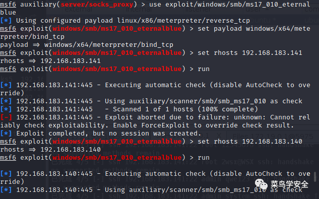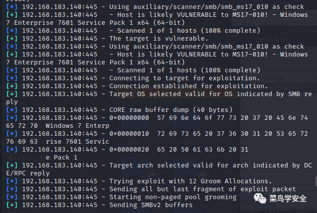 发现有同网段主机一台win7,并且有永恒之蓝的漏洞。这里就想要利用永恒之蓝,cs在liunx上的功能还是比较缺失的,这里还是先用msf打一波。