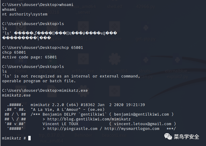 拿到内网一台主机,首先就想抓他的密码,加上这台主机是win7,是可以直接抓取到明文密码的。这里已经上传了一个mimikatz,直接利用。