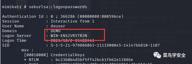 通过mimikatz抓取,获得了域内用户douser的sid和明文密码,并且知道域名称等信息,使用工具直接利用。