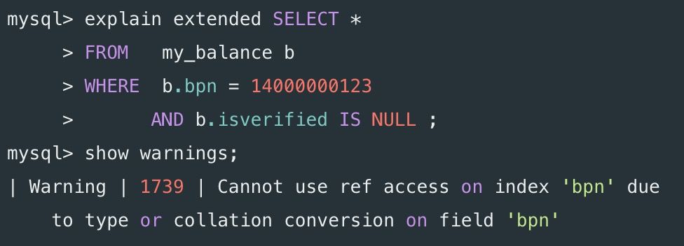 SQL语句中查询变量和字段定义类型不匹配是另一个常见的错误。比如下面的语句:其中字段 bpn 的定义为 varchar(20),MySQL 的策略是将字符串转换为数字之后再比较。函数作用于表字段,索引失效。上述情况可能是应用程序框架自动填入的参数,而不是程序员的原意。现在应用框架很多很繁杂,使用方便的同时也小心它可能给自己挖坑。3、关联更新、删除