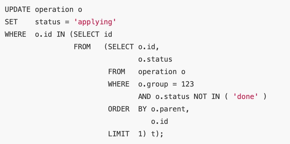 虽然 MySQL5.6 引入了物化特性,但需要特别注意它目前仅仅针对查询语句的优化。对于更新或删除需要手工重写成 JOIN。比如下面 UPDATE 语句,MySQL 实际执行的是循环/嵌套子查询(DEPENDENT SUBQUERY),其执行时间可想而知。重写为 JOIN 之后,子查询的选择模式从 DEPENDENT SUBQUERY 变成 DERIVED,执行速度大大加快,从7秒降低到2毫秒4、混合排序