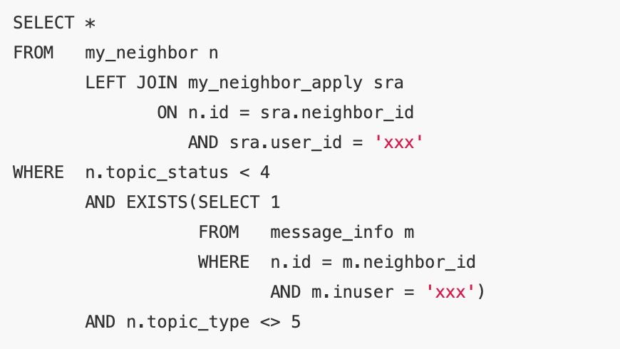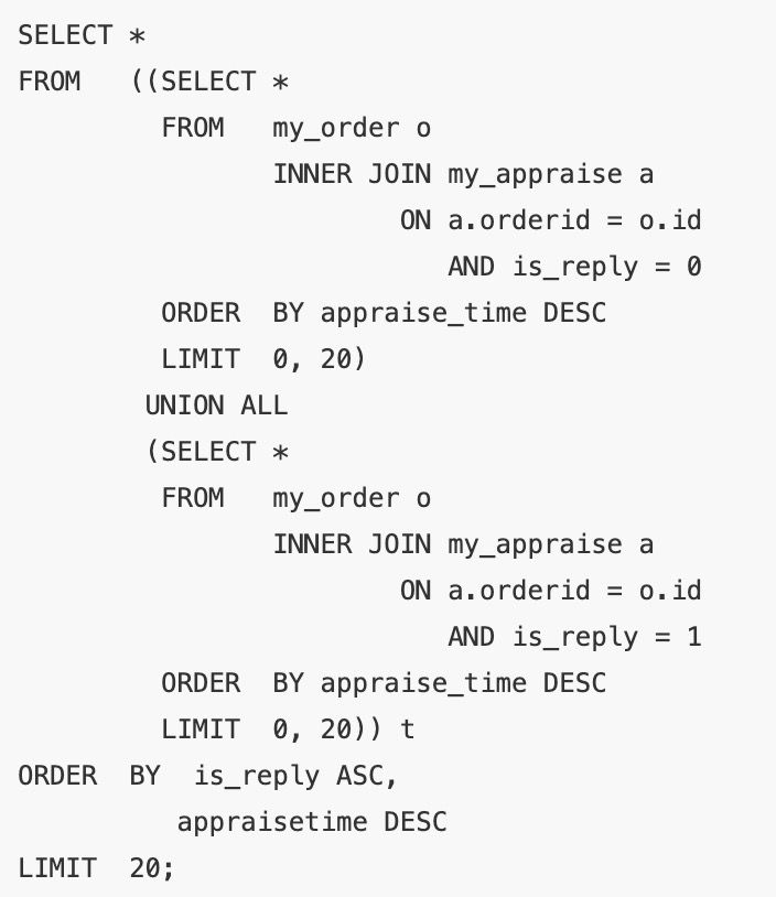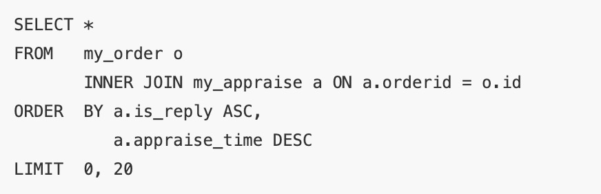 MySQL 不能利用索引进行混合排序。但在某些场景,还是有机会使用特殊方法提升性能的。由于 is_reply 只有0和1两种状态,我们按照下面的方法重写后,执行时间从1.58秒降低到2毫秒。5、EXISTS语句
