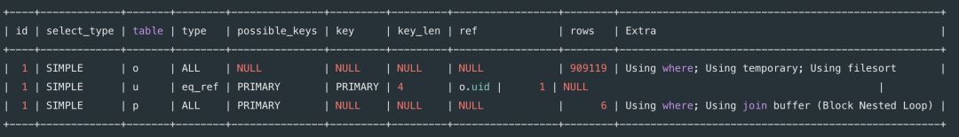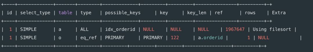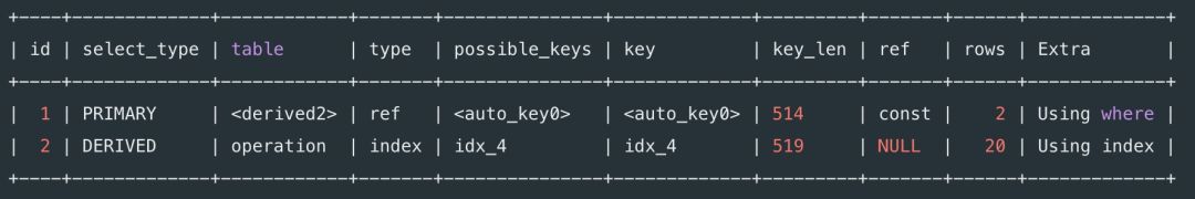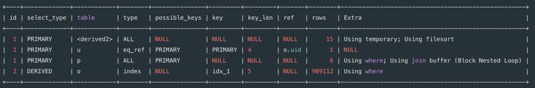 外部查询条件不能够下推到复杂的视图或子查询的情况有:如下面的语句,从执行计划可以看出其条件作用于聚合子查询之后由于最后 WHERE 条件以及排序均针对最左主表,因此可以先对 my_order 排序提前缩小数据量再做左连接。SQL 重写后如下,执行时间缩小为1毫秒左右。再检查执行计划:子查询物化后(select_type=DERIVED)参与 JOIN。虽然估算行扫描仍然为90万,但是利用了索引以及 LIMIT 子句后,实际执行时间变得很小。8、中间结果集下推