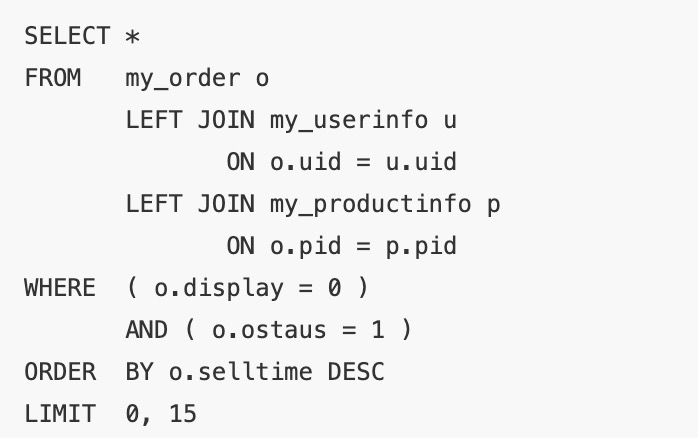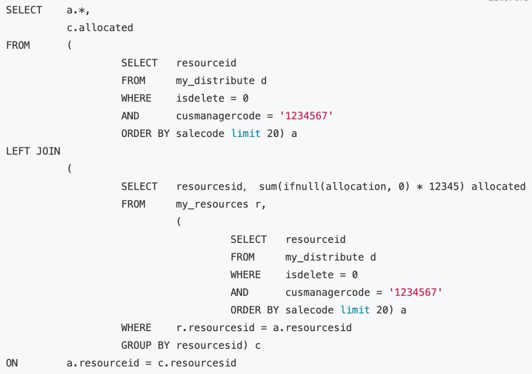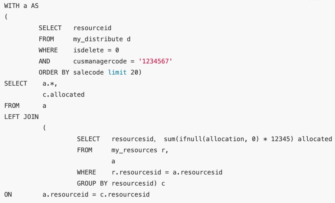 再来看下面这个已经初步优化过的例子(左连接中的主表优先作用查询条件):那么该语句还存在其它问题吗?不难看出子查询 c 是全表聚合查询,在表数量特别大的情况下会导致整个语句的性能下降。其实对于子查询 c,左连接最后结果集只关心能和主表 resourceid 能匹配的数据。因此我们可以重写语句如下,执行时间从原来的2秒下降到2毫秒。但是子查询 a 在我们的SQL语句中出现了多次。这种写法不仅存在额外的开销,还使得整个语句显的繁杂。使用 WITH 语句再次重写:数据库编译器产生执行计划,决定着SQL的实际执行方式。但是编译器只是尽力服务,所有数据库的编译器都不是尽善尽美的。上述提到的多数场景,在其它数据库中也存在性能问题。了解数据库编译器的特性,才能避规其短处,写出高性能的SQL语句。程序员在设计数据模型以及编写SQL语句时,要把算法的思想或意识带进来。编写复杂SQL语句要养成使用 WITH 语句的习惯。简洁且思路清晰的SQL语句也能减小数据库的负担 。
