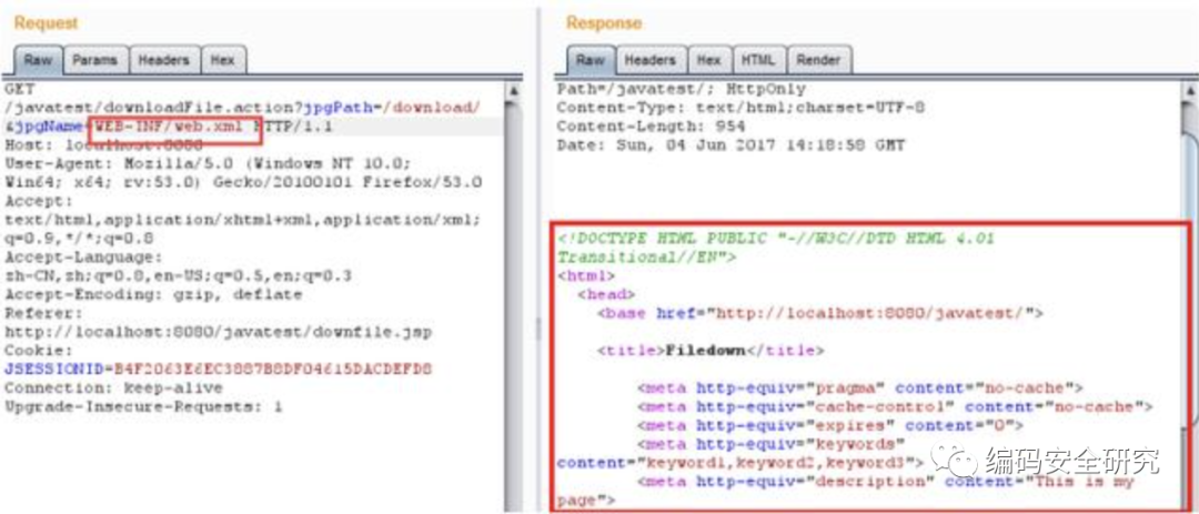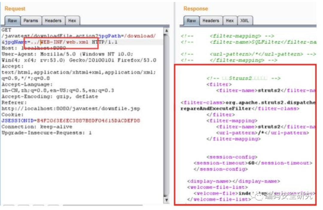 在此处直接替换文件名为“WEB-INF/web.xml”,尝试下载系统配置文件: