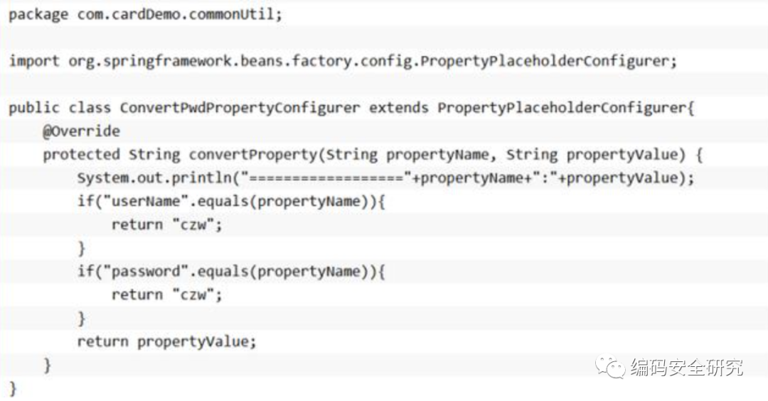 将上面的第一个代码修改为第二个代码,第一个类是负责抓取jdbc.properties中的属性并且填充到dataSource当中来,这样,我们就可以将所有的注意力都集中在jdbc.properties上了。然后扩展PropertyPlaceholderConfigurer父类PropertyResourceConfigurer的解密方法convertProperty: