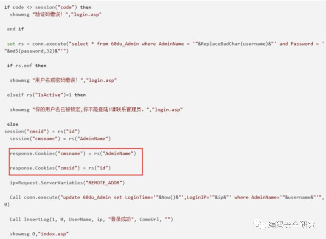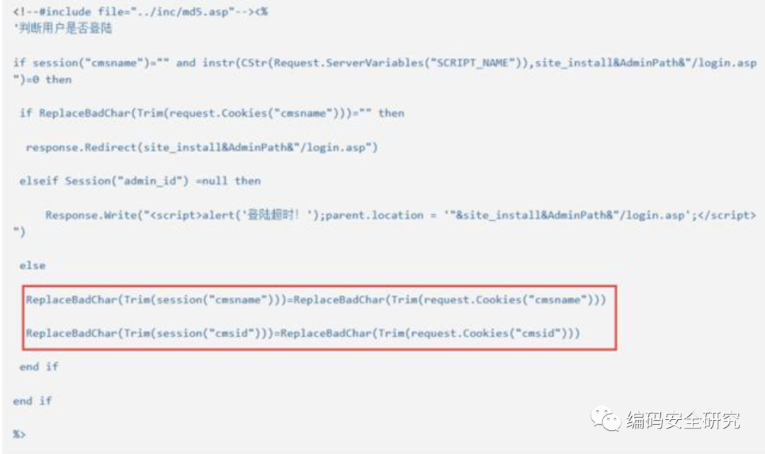 网页会把输入的管理员帐号和管理员ID分别赋值给cmsname和cmsid这两个cookies值,如果密码正确就会跳转到后台首页,并添加上述的两个cookies值。检查用户登录状态的文件,源代码如下: