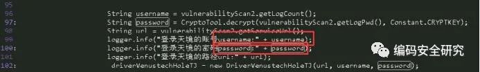 在代码100行处,直接将用户名密码明文形式记录在日志中。