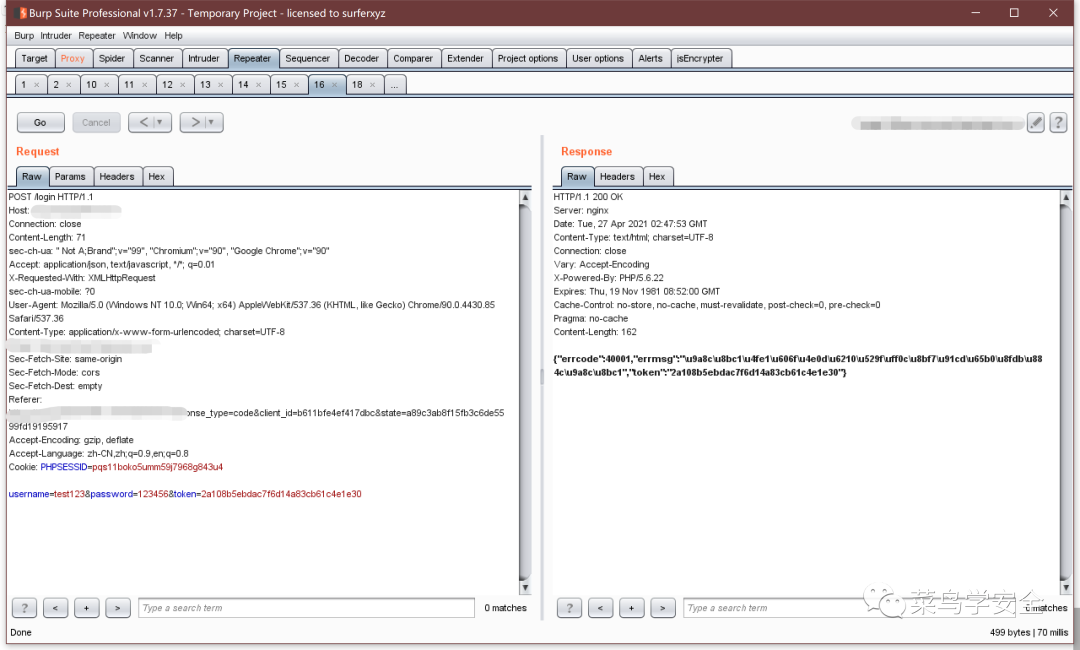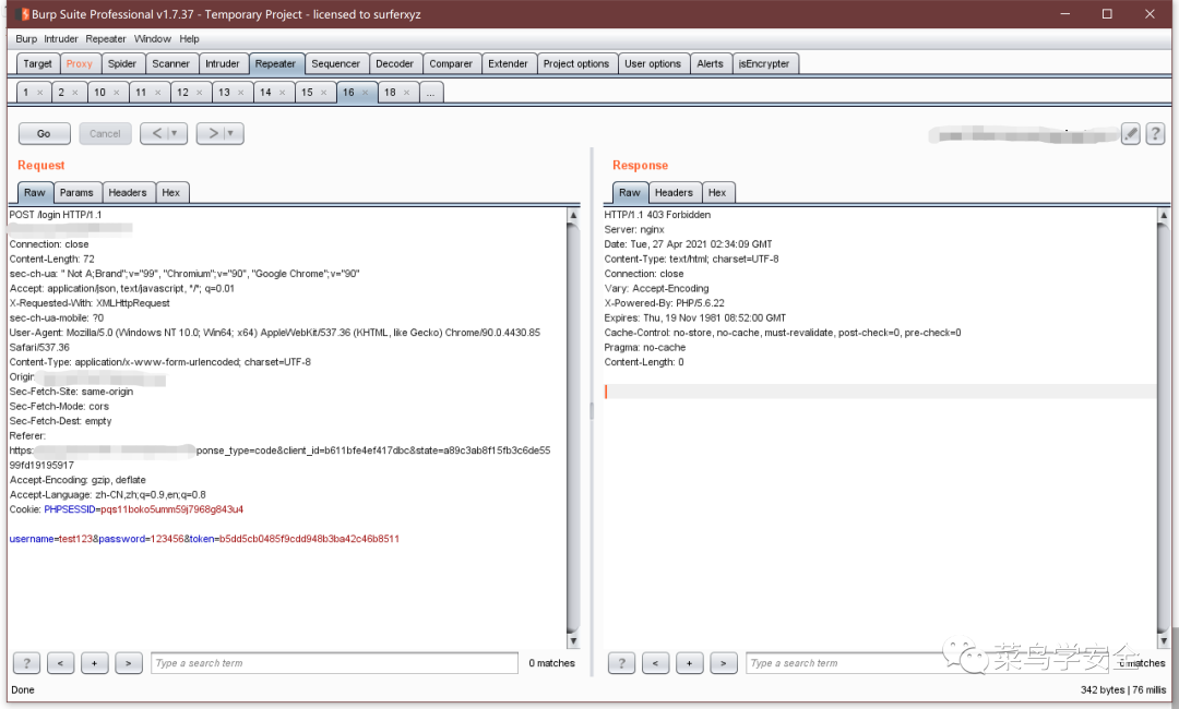 接下来可以直接去repeater测试了,每次运行Token都会自动变化,省去了我们写脚本的时间